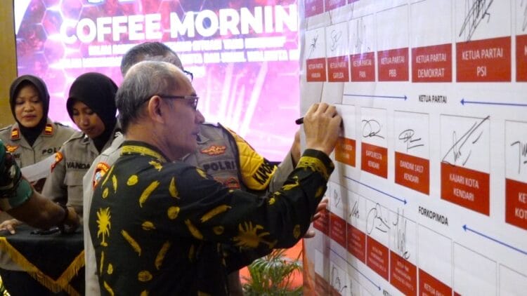 Kendari, Tajukinfo.com – Pemerintah Kota (Pemkot) Kendari menandatangani deklarasi damai jelang Pemilihan Wali Kota dan Wakil Wali Kota (Pilwali) Kota Kendari 2024 di salah satu hotel di Kota Kendari, Kamis 3 Oktober 2024.