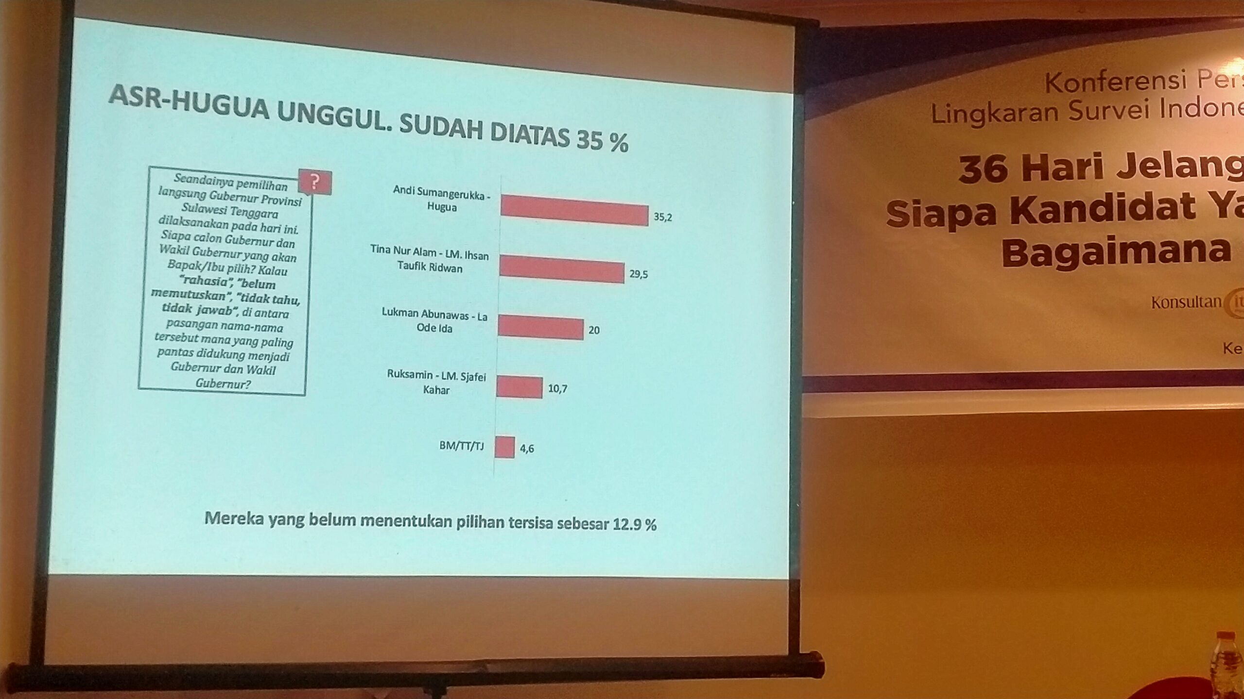 “Survei menunjukan bahwa dukungan terhadap ASR-Hugua sebesar 35,2 persen, disusul Tina Nur Alam-LM Ihsan Taufik Ridwan (Tina-Ihsan) sebesar 29,5 persen, kemudian pasangan Lukman Abunawas-La Ode Ida (LA-Ida) sebesar 20 persen dan terakhir pasangan Ruksamin-LM Sjafei Kahar (RuksaminSjafei) sebesar 10.7 persen,” jelasnya lagi.
